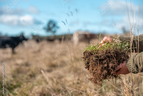 © Phoebe, Fototapeta premium female farmer on a farm. women in agriculture working hard in stock yards herding cattle to weigh cows. organic and free range livestock sustainable ranch, grown on a farm in tasmania Australia.