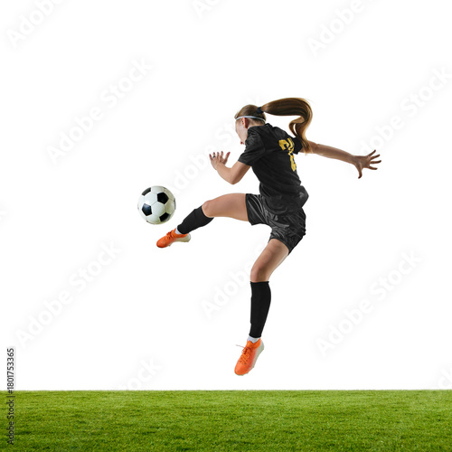 © Lustre Art Group , Naklejka premium Female football player in powerful mid-air strike with focused intensity. Concept of peak action, sports ads, agility programs, fitness promotion, match visuals.