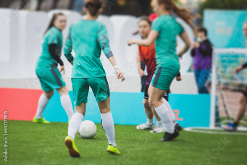 Fototapeta premium Female football street match outdoor game on an artificial astroturf lawn, girls play soccer game on a pitch field, young women participate in football competition on a stadium with green grass
