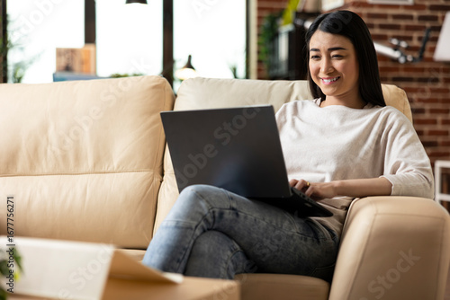 Fototapeta premium Female freelancer researching strategies and reviewing emails while managing tasks remotely. Asian entrepreneur excited after completing financial data and project presentation from home.