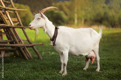 © Lubo Ivanko, Obraz premium Female goat standing on a farm meadow. Photo from side.