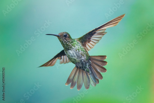 Fototapeta premium Female Golden-tailed Sapphire - Chrysuronia oenone, beautiful colored hummingbird from Andean slopes of South America, Wild Sumaco, Ecuador.
