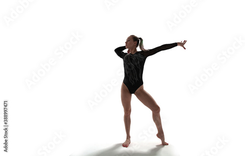 Fototapeta premium Female gymnast doing a complicated trick isolated on white.