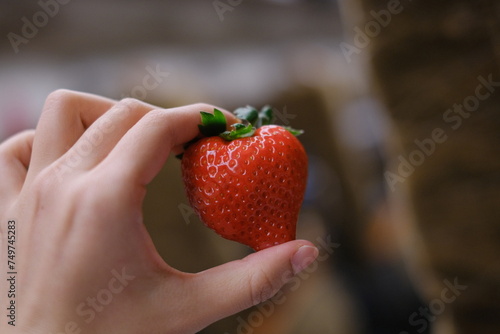 Obraz premium Female hand harvesting red fresh ripe organic strawberry Woman picking strawberries in field, closeup. in Japan