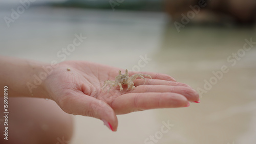 Obraz premium female hand hold small ghost sand crab