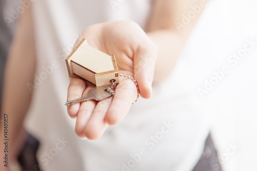 © oatawa, Fototapeta premium Female hand holding key house shaped keychain.