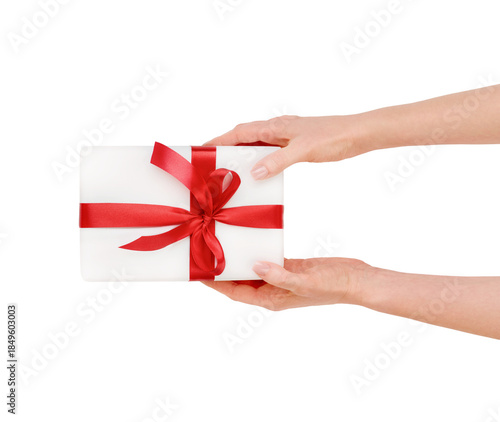 © kasia2003, Fototapeta premium Female hand holding or present white gift box with red silk bow isolated on white background with clipping path. Design element.