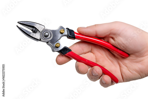 © Naem, Obraz premium Female Hand Holding Red-Handled Pliers, isolated on a transparent background.