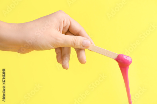 © Pixel-Shot, Fototapeta premium Female hand with sugaring paste on stick against color background