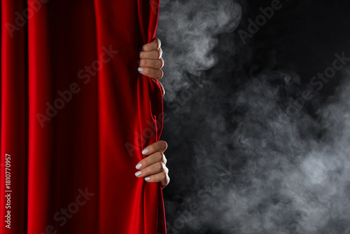 Fototapeta premium Female hands behind red curtain with smoke on dark background
