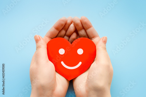 Obraz premium female hands hold a paper heart with happy smiley face