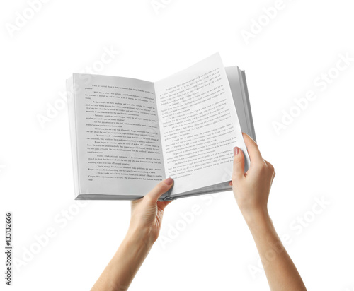 © Africa Studio, Fototapeta premium Female hands holding opened book on white background