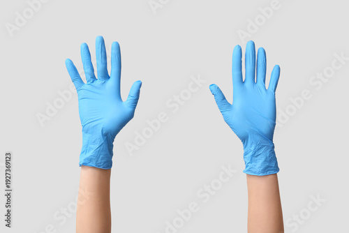 © Pixel-Shot, Obraz premium Female hands in medical gloves on grey background