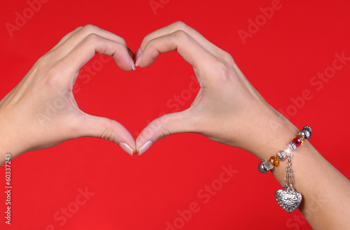© Guzel Studio, Fototapeta premium Female hands making a heart shape over red background
