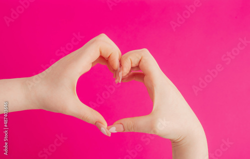 © Maya Kruchancova, Fototapeta premium female hands making heart gesture on pink background