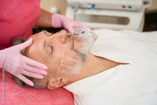 © Viacheslav Yakobchuk, Obraz premium Female hands of dermatologist make man smas lifting in clinic