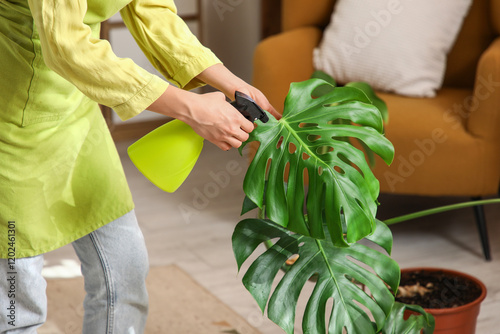 Obraz premium Female hands spraying water on houseplant at home, closeup