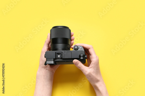 Obraz premium Female hands with modern professional photo camera on yellow background
