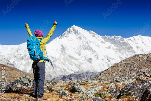 © olyphotostories, Obraz premium Female hiker cheering elated and blissful with arms raised in the sky after hiking in Himalayas