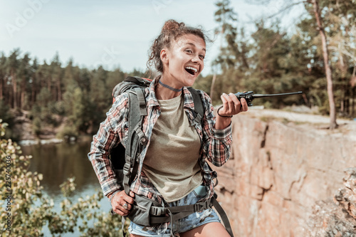 Naklejka premium Female hiker. Dark-haired female hiker wearing denim shorts and squared shirt using her pager while talking to her friend