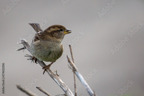 Fototapeta premium Female House sparrow (Passer domesticus) perched on twigs with blurred...