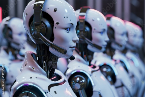 Fototapeta premium Female Humanoid Robots in Customer Service Call Center Setting, Wearing Headsets and Engaged in Work, Illustrating Technology and Service Industry Concept