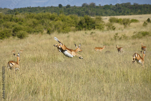 Naklejka premium Female impalas running and jumping, Masai Mara Game Reserve, Kenya