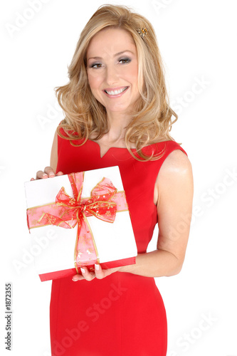 © Leah-Anne Thompson, Fototapeta premium female in red dress holding a present