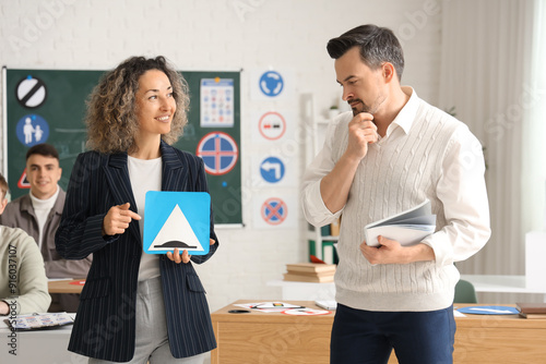 © Pixel-Shot, Fototapeta premium Female instructor with road sign and man at driving school