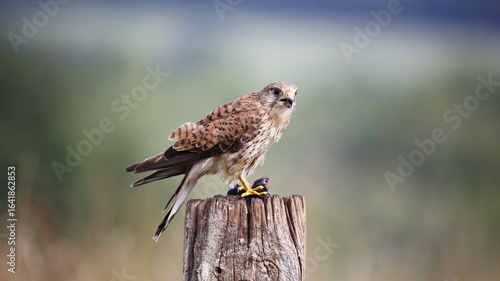 © Stephen, Fototapeta premium Female kestrel with prey sat on post