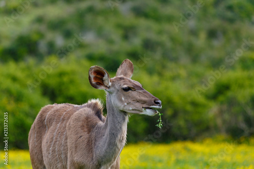 Fototapeta premium Female kudu chewing on a leaf