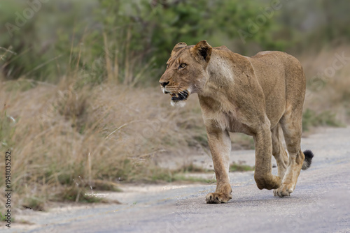 Fototapeta premium Female Lion walks along the road in Kruger National Park