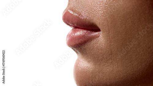 © master1305, Obraz premium Female lips side view with smooth hydrated surface and natural gloss. Concept of cosmetic surgery aesthetic clinics, beauty skincare, and pharma derma cosmetics