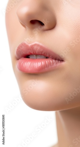 Obraz premium Female lips with natural pink lipstick or lip gloss on a woman, showcasing...