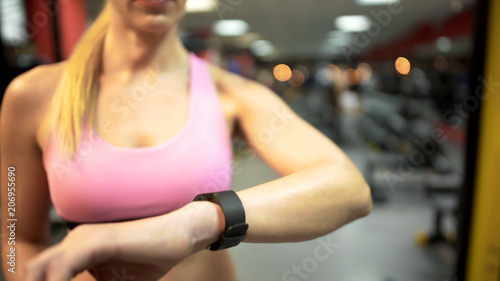 Fototapeta premium Female looking at her smart watch before starting training in gym, fitness app