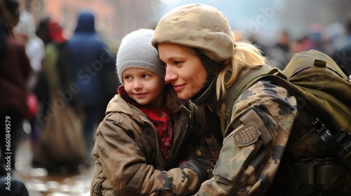© Meow Creations, Fototapeta premium Female medical soldier hugging her child