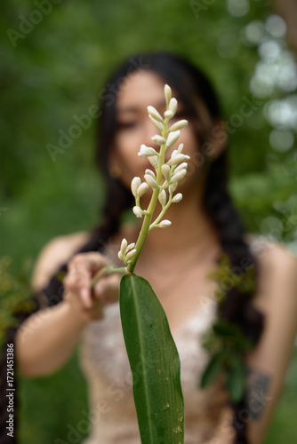 © Tuan, Obraz premium Female model posing in lace gown outdoors.