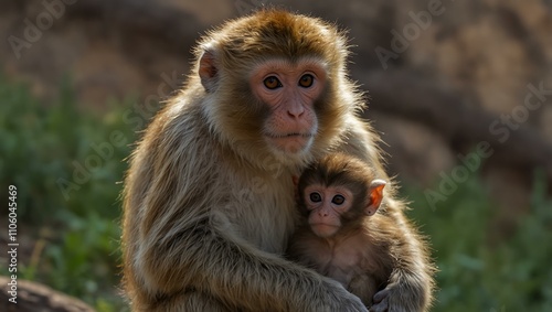 © claudunia, Obraz premium Female monkey with baby in Daulatabad, India.