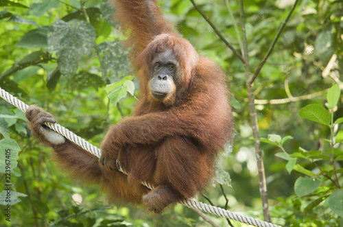 © Elles Rijsdijk, Naklejka premium Female orang-utan hanging in a tree looking at camera