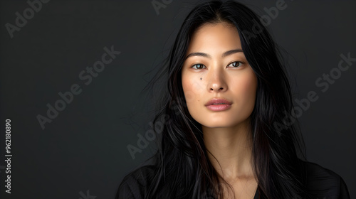 Fototapeta premium female oriental beauty with naytural complexion, long shiny hair professional makeup, smooth skin posing with soft expression