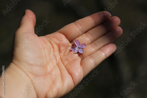 Obraz premium female palm with life lines, on which lies one lilac flower, on a blurred dark background