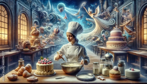 © soysuwan123, Fototapeta premium Female pastry chef in a pastry shop. 3d rendering toned image.