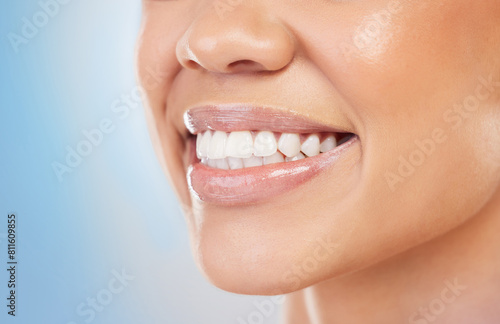 Obraz premium Female person, smile and zoom for treatment, filling and polish for cosmetic in blue background. Teeth, closeup and dental with hygiene, mouth and oral care for health, wellness and clean in studio