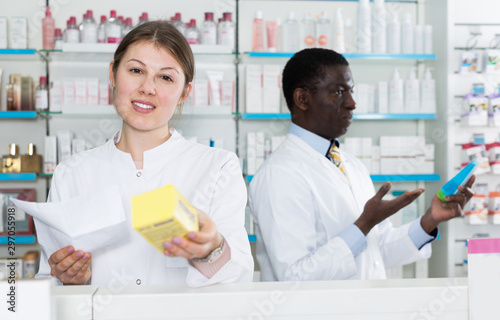 © JackF, Obraz premium Female pharmaceutist showing medicines in pharmacy