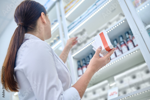 © zinkevych, Obraz premium Female pharmacist making inventary in a drugstore