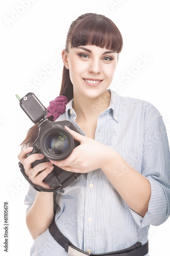 © danmorgan12, Fototapeta premium Female Photographer Holding a Professional Camera and Smiling