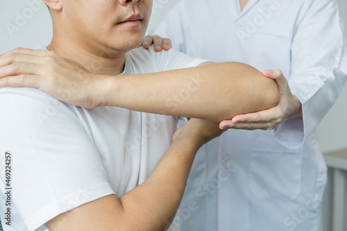 © Orathai, Obraz premium Female physiotherapists provide assistance to male patients with elbow injuries examine patients in rehabilitation centers. Physiotherapy concepts