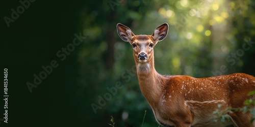 © AkuAku, Fototapeta premium Female red deer in a forest setting natural habitat, autumn seasonal change