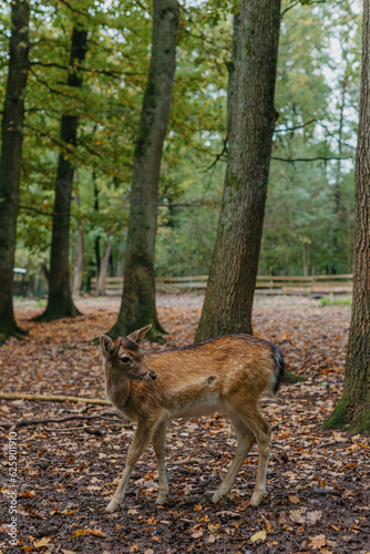© andreiko, Fototapeta premium Female Red deer stag in Lush green fairytale growth concept foggy forest landscape image