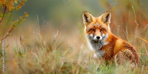 Fototapeta premium Female red fox in the wild within a grassy setting.